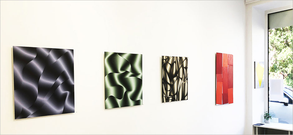 Darüber hinaus zeigt Jürgen Forster eine Reihe von Papierschnitten, die ebenfalls aus Liniengittern in geometrischen Formen bestehen und farbig hinterlegt sind. Durch sich wiederholende Linien- und Farbstrukturen mit wechselndem Duktus sowie mit Schattenmustern entstehen eigenwillige und auch magische grafische Bildkonstrukte