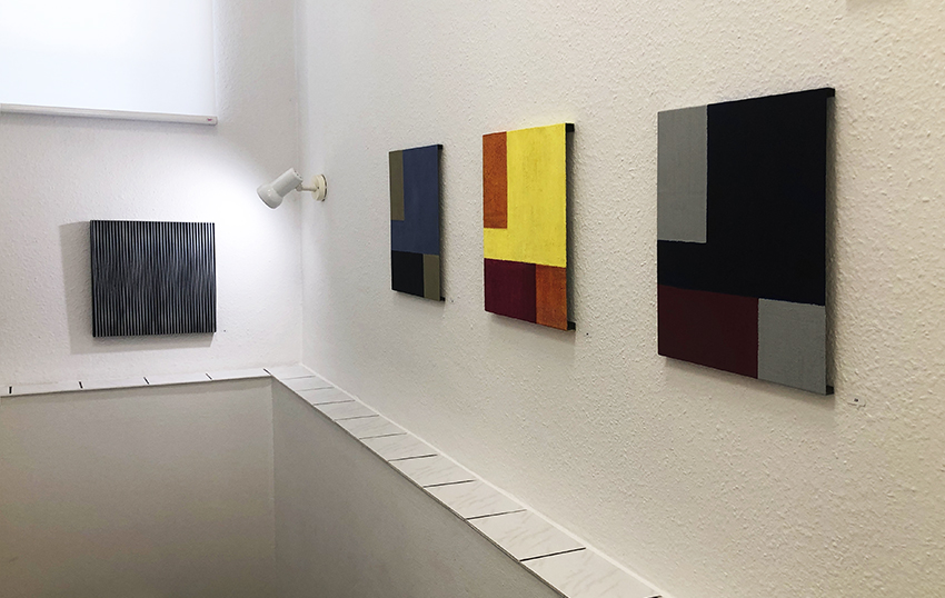 Links: Cornelia Rohde: „506“, Acryl auf Holz, 40 x 40 cm, 2025 (Ausstellungsfoto)